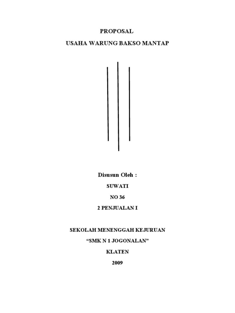 Nah sebelum itu, anda harus membuat rencana usaha yang dituangkan dalam sebuah proposal usaha /bisnis. Sesuai namanya, proposal ini digunakan untuk kepentingan pengadaan proyek seperti pembangunan gedung dan sebagainya. Anda tentu sudah berupaya keras menyusun gagasan, jadi tuangkan setiap gagasan tersebut. Terimakasih saya haturkan kepada para ibu/bapak yang 8 annisa nur salam [13810025] rumah bimbel kita telah bersedia meluangkan waktunya untuk membaca proposal ini. 25 full pdfs related to this paper. Membuat proposal berkualitas akan membuka berbagai peluang bagi para profesional. Atau untuk alasan kemanusiaan dan lain sebagainya. Jan 26, 2021 · contoh proposal bisnis plan 1.